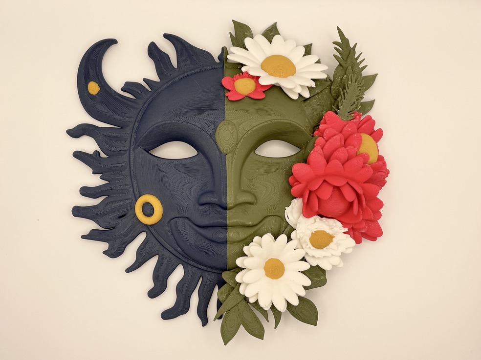 This vibrant (day) and mystic (night) dual-sided mask is the perfect centerpiece for anyone struggling to decide between being a celestial night owl or a flower-crowned garden party goer, offering a simple solution to your dual-personality.