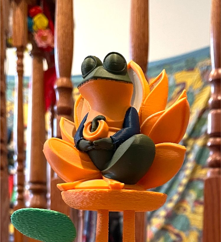A serene frog, balanced in meditation upon a vibrant orange lotus flower. Perched gracefully, it achieves perfect tranquility, making it a perfect accent for a peaceful office desk or a background shelf.
