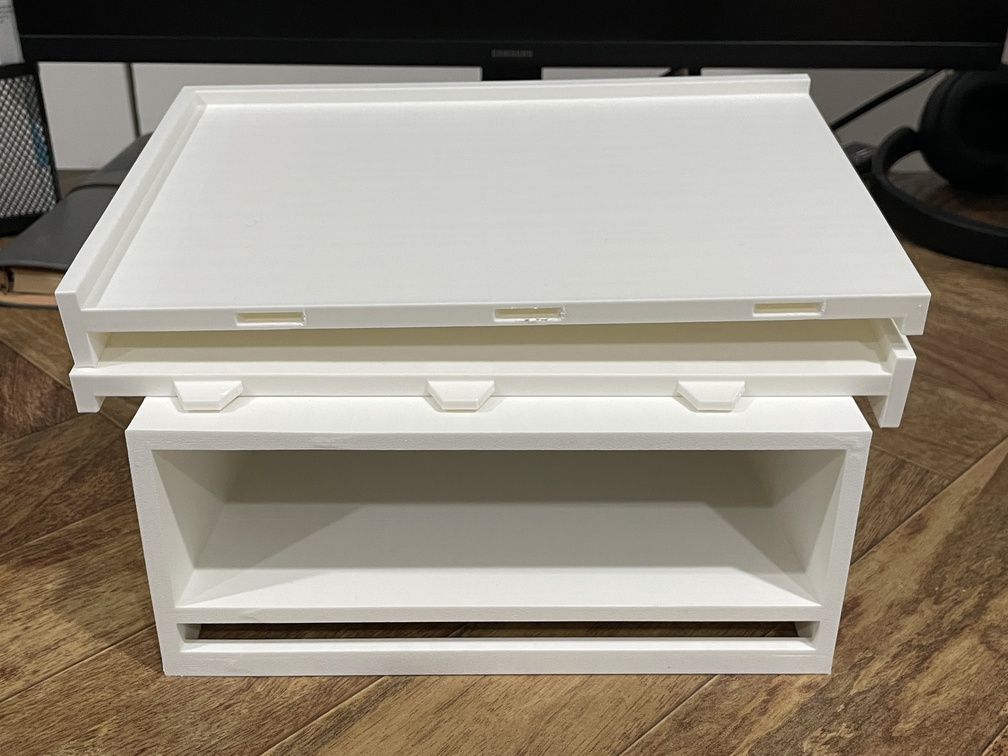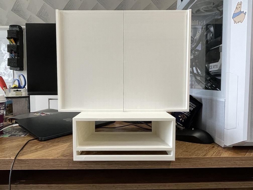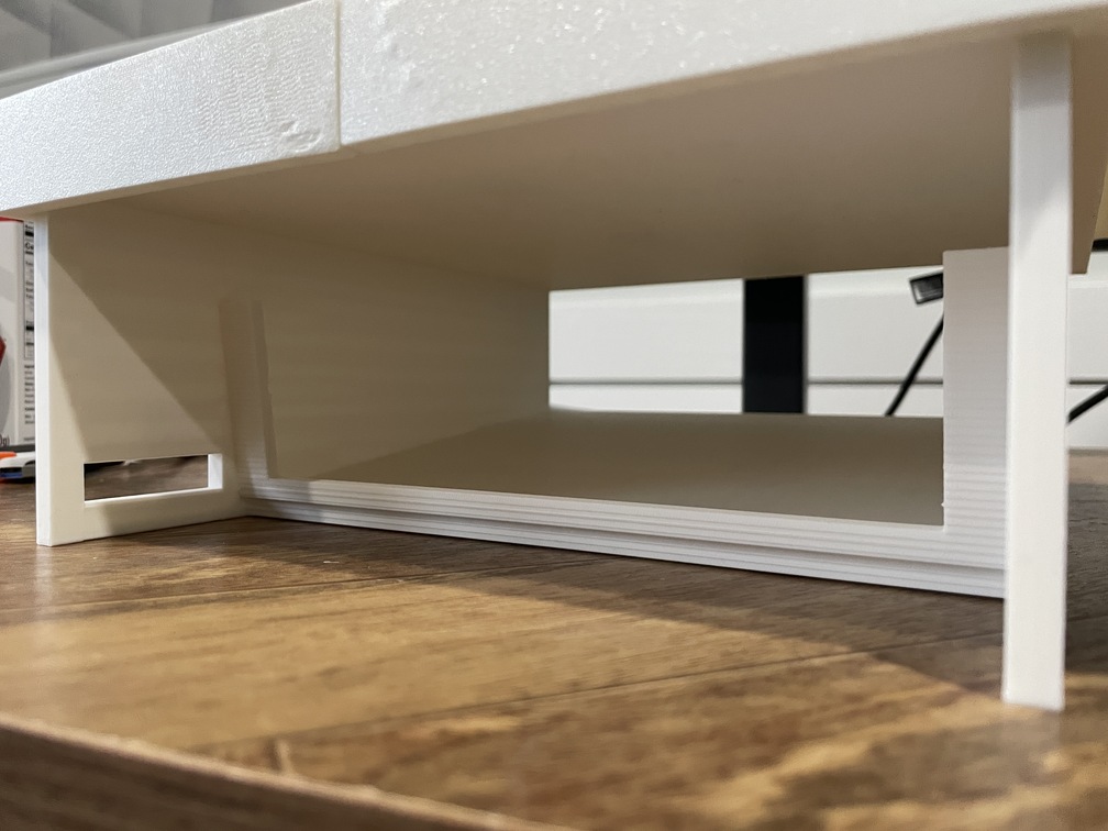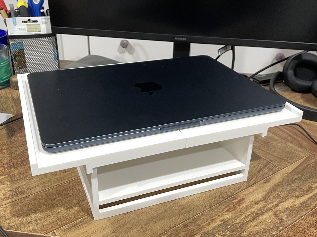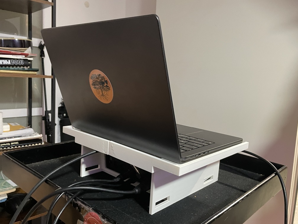 The laptop stand provides a solution with enough flexibility. When fully assembled, a laptop can be put on top and carried around, the short walls prevent it from sliding and falling. The accessory shelf below is designed for the audio interface, it can also be used to put things like books and tools. It is angled down and protected at the bottom from falling. The opening on the back gives cable access to the interface.